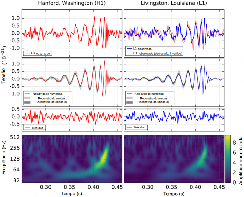 Figura 2: GW150914 observado pelos detectores em Hanford (coluna à esquerda) e em Livingston (coluna à direita). Os painéis no topo mostram a tensão medida em cada um dos detectores. A segunda linha mostra a tensão na banda 35-350 Hz (excluindo altas e baixas frequências), uma forma de onda para um sistema com parâmetros consistentes com GW150914 (linha sólida) obtida por relatividade numérica, e as regiões de 90% de confiança para duas formas de onda reconstruídas (em cinza). A terceira coluna mostra o ruído residual depois de subtraído o sinal observado da forma de onda filtrada obtida por relatividade numérica. [Figura 1 do artigo]Já que o LIGO precisa ser sensível a esses minúsculos sinais de ondas gravitacionais, é também suscetível a várias fontes de ruído instrumentais e ambientais. Os dados do LIGO são inerentemente dominados por ruído. Embora coerência entre os dois detectores seja usada como uma triagem inicial (sinais astrofísicos devem ser detectados em ambos detectores com um tempo de diferença igual ou menor do que o tempo de viagem da luz), técnicas sofisticadas de análise de dados ainda são necessárias para procurar pelos sinais astrofísicos reais. Um dos métodos utilizados envolve buscar por sinais autenticamente “altos”. Contudo, tentar encontrar um sinal de onda gravitacional é como tentar ouvir uma única conversa em uma festa muito barulhenta – ajuda bastante saber como a conversa deve soar. Essas forma de onda “modelo” são comparadas a dados do LIGO como outro meio de buscar por sinais astrofísicos reais. Ambas essas técnicas de busca recuperaram o sinal GW150914, fornecendo o nível de confiança de 5-sigma que é típico de descobertas científicas. Isso significa que a taxa com que um sinal análogo a GW150914 é criada por ruído é menor do que uma em 203000 anos!