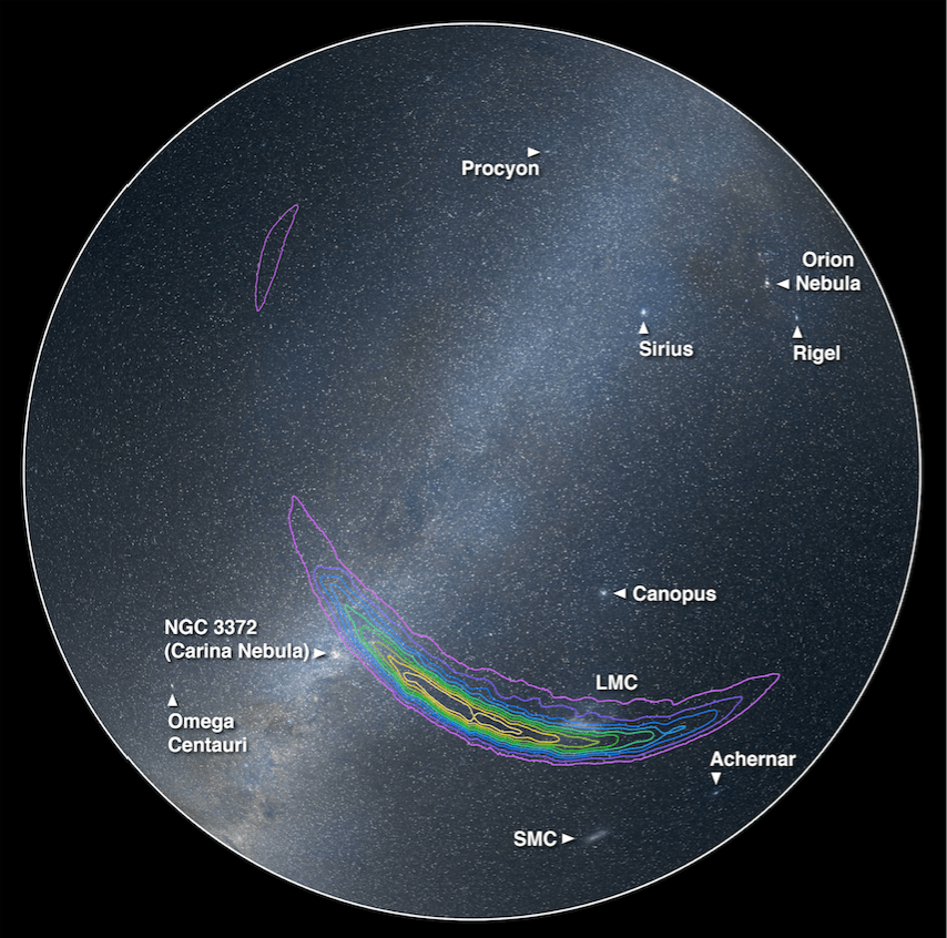 Figura 3: a localização estimada derivada computacionalmente. As diferentes cores marcam aumentos em 10% na probabilidade de que GW150914 tenha vindo dessas regiões. Note que não esperamos ver uma contrapartida eletromagnética para a fusão de dois buracos negros. [Figura obtida a partir da figura 4 do artigo complementar Properties of the binary black hole merger GW150914.]Além de consistir na primeira detecção direta de ondas gravitacionais, GW150914 é carregado de implicações astrofísicas. Esse evento fornece a primeira evidência observacional de sistemas binários de buracos negros, e nos diz que esses sistemas podem fundir-se em tempos menores que a idade do Universo. GW150914 também fornece a primeira evidência de que buracos negros com essas massas existem na natureza; antes dessa descoberta, evidência indireta de buracos negros de massa solar apenas revelava massas até ~20 massas solares. Como um bônus, GW150914 forneceu um teste único para teoria centenária de Einstein (que passou com honras), bem como foi o primeiro teste verdadeiro do regime de campo forte da relatividade geral.