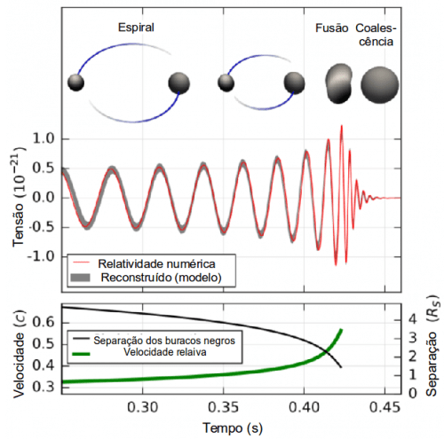Figura 4: imagens de um modelo de relatividade numérica (topo), a tensão da onda gravitacional (meio) e a velocidade relativa e separação entre os buracos negros (inferior) para GW150914 como função do tempo. A pequena distância entre os objetos antes de fusão (que é obtida da forma de onda) indica que são de fato buracos negros. [Figura 2 no artigo]A descoberta de GW150914 representa resultados do primeiro mês da primeira série de observações da forma avançada do LIGO, que durou um total de quatro meses. Durante esse primeiro mês, outro possível sinal foi encontrado: LVT151012. Embora muito mais fraco que GW150914 e não significativo o suficiente para ser declarado uma detecção, é possivelmente astrofísico e resultando da coalescência de dois buracos negros. Da detecção de GW150914 e possível detecção de LVT151012 durante o primeiro mês, a taxa de fusão de buracos negros para sistemas análogos a esse pode ser estimada. Incluindo ambos GW150914 e LVT151012, a taxa de fusão para essas classes de buracos negros é da ordem de ~6-400 por giga-parsec cúbico por ano.