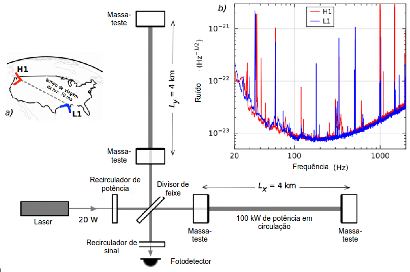 Figura 1: um diagrama simplificado de um detector do LIGO. O painel acima, à esquerda, mostra a localização e orientação dos dois detectores LIGO, indicando o tempo de viagem na velocidade da luz entre os detectores. O painel acima, à direita, mapeia o ruído nos detectores de Livingston (L1) e Hanford (H1). O ruído é dominado por atividade sísmica a baixas frequências e ruído elétrico a altas frequências. Ruídos intensos e estreitos são causados por diversas fontes, como modos vibracionais do sistema de suspensão. [Figura 3 no artigo]O sinal detectado pelo LIGO em 14 de setembro, chamado GW150914, veio da fusão de dois buracos negros que tinham cerca de 36 e 29 vezes a massa do Sol. Durante o segundo antes de esses gigantes fundirem-se, a energia liberada em onda gravitacionais pelo sistema foi dez vezes maior que a energia liberado por todas as estrelas no universo observável! Contudo, como o espaço-tempo é muito “rígido”, e os buracos negros se fundiram a mais de um bilhão de anos-luz de distância, um evento tão poderoso como esses criou um minúsculo efeito no espaço ocupado pela Terra.