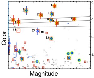 Eles então construíram o CMD das galáxias no aglomerado distante (Figura 3). Todos os aglomerados desde redshift z=1 até hoje têm sequências vermelhas estreitas, como na Figura 1 acima. Mas estas observações mostram que esse não é o caso para o aglomerado em redshift z=2, cuja sequência vermelha é aproximadamente duas vezes mais larga que a maioria dos aglomerados recentes. Essas diferenças entre aglomerados no passado e no presente implicam que aglomerados estavam provavelmente ainda evoluindo significativamente nos 2,5 bilhões de anos entre redshift 1 e 2, mas não sofreram mudanças significativas desde então.