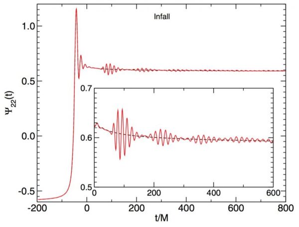Quando você atinge um sino, ele vibra; a superfície do sino oscila entre diferentes configurações até que a vibração é amortecida e o som para. Da mesma forma, se você “atinge” um buraco negro perturbando-o com alguma massa, ele vai vibrar até se tornar estacionário novamente. Um buraco negro é como um sino cósmico que vai vibrar por meio de oscilações na sua estrutura. O amortecimento da vibração por meio da emissão de ondas gravitacionais é chamado de ringdown.