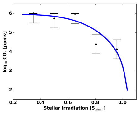 Um dos exemplos que os autores descrevem no artigo de hoje tem como objetivo testar o conceito de zona habitável usando abundâncias de dióxido de carbono. Planetas que recebem mais irradiação de suas estrelas precisam de menos CO2 para manter temperaturas confortáveis através do efeito estufa, enquanto que aqueles que recebem menos irradiação precisam de mais dióxido de carbono. A ideia deste teste é medir o conteúdo de CO2 em planetas dentro de zonas habitáveis e ver se ele é compatível com a quantidade esperada para planetas com temperaturas confortáveis (veja a figura abaixo). Essas medidas não precisam ser extremamente precisas já que as incertezas das propriedades físicas dos planetas são compensadas pelo tamanho da amostra.