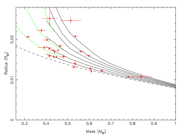 Matéria degenerada tem uma propriedade muito legal: a pressão não depende da temperatura. Isso é porque a energia cinética desses elétrons impedidos de moverem-se para estados mais baixos de energia são bastante altas, e as taxas de colisão entre elétrons e outras partículas são bastante baixas, de modo que os elétrons essencialmente viajam à velocidade da luz. A pressão no gás depende da velocidade dos elétrons; como a velocidade da luz é o mais rápido que eles podem ir, adicionar calor não vai alterar a pressão. Isso tem um efeito um tanto contra-intuitivo: como a única forma de aumentar a pressão é adicionando massa, quando a pressão aumenta, a gravidade também aumenta e as partículas aproximam-se umas das outras, de modo que o objeto torna-se menor. Em outras palavras, quando mais massiva uma anã branca, menor é o se raio. Como consequência dessa estranha propriedade, existe uma relação entre a massa e o raio de uma anã branca, de modo que, se você conhece o valor de um, pode estimar o outro e vice-versa. Mas o quão precisa é essa relação massa-raio? Os autores do artigo de hoje decidiram testar!