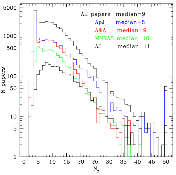 O autor pesquisou artigos escritos para as quatro principais revistas: Astronomy & Astrophysics (A&A), Astronomical Journal (AJ), Astrophysical Journal (ApJ) e Monthly Notices of the Royal Astronomical Society (MNRAS). Descartando artigos de apenas uma página (que são tipicamente erratas ou editoriais), a amostra final continha em torno de 30.000 artigos. O intervalo de número de páginas desses artigos é mostrado na Figura 1. Há um número significante de artigos de quatro páginas, as chamadas letters, que tem número máximo de quatro páginas e divulgam um resultado imediatamente relevante em algum campo. O número de páginas tem um pico em torno de seis, diminuindo para artigos mais longos.