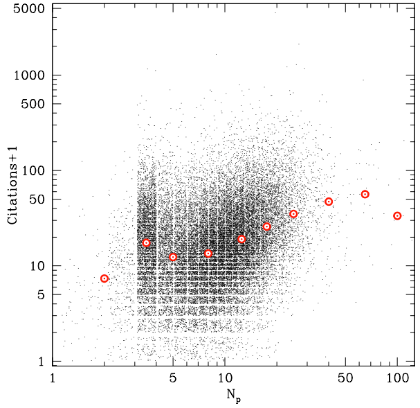 E o que tiramos disso? Não há uma única interpretação possível, mas o autor aproveita a oportunidade para dar alguns conselhos profissionais bem-humorados. Para estudantes de pós-graduação, o número de artigos publicados como primeiro autor pode ter um papel importante na busca por um pós-doutorado ou por um primeiro emprego na academia. Isso implica que escrever muitos artigos, e publicá-los no astro-ph próximo ao horário final para submissões, para que estejam no topo da lista, é útil, independente da extensão do artigo. Para pesquisadores mais sênior, quando o número de citações por artigo se torna mais importante (para aumentar o índice-h), escrever artigos mais longos pode ser mais importante. Isso dito, não existe, é claro, uma fórmula mágica para escrever artigos de alto impacto. A Figura 3 mostra que há um alto espalhamento no número de citações por artigo para artigos de mesma extensão.