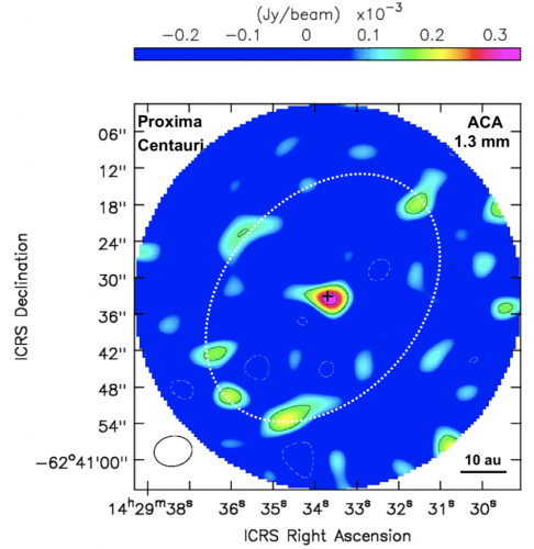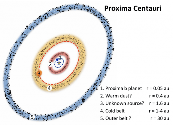 Depois da análise da Figura 2 abaixo, os autores viram que Proxima Centauri parece emitir luz infravermelha em excesso, o que os levou a concluir que a mesma deve ser produzida por um cinturão, ou anel, de poeira fria (50 K). O cinturão de poeira tem um raio com quatro vezes a distância entre a Terra e o Sol (i.e. 4 unidades astronômicas, AU). Na verdade, esse anel de poeira parece ser análogo ao Cinturão de Kuiper em torno do Sol.