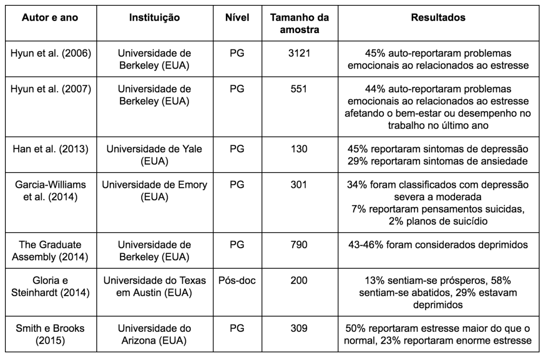 Os autores realizaram uma revisão de artigos sobre a saúde mental de pesquisadores, focando-se em estudos sobre doenças que podem ser diagnosticadas clinicamente. Eles encontraram que as taxas de doenças mentais são mais altas entre pesquisadores do que entre a população em geral. Além disso, as taxas são particularmente alarmantes entre cientistas júnior (estudantes de pós-graduação e pós-doutores). Considerando a média entre diversos estudos (veja a tabela abaixo), eles encontram que pelo menos 40% dos estudantes de pós-graduação sofrem com sintomas de saúde mental ao nível de doenças clínicas.
