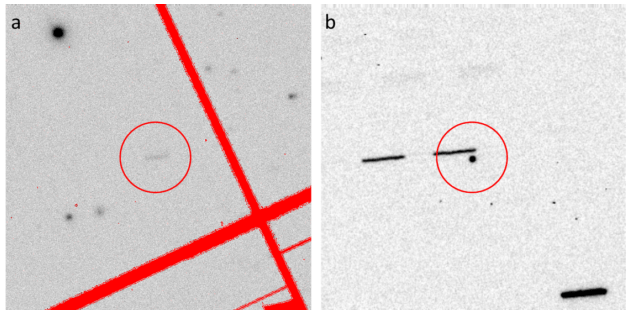 O objeto foi notado pela primeira vez na noite the 19 de outubro de 2017 em imagens do telescópio Pan-STARRS 1, no Havaí. Ele chamou atenção porque se movia tão rápido que, com apenas 45 segundos de exposição no detector, já formava um risco em vez de um simples ponto na imagem (veja a Figura 1a). Para melhor entender o objeto, os autores do artigo acionaram outros telescópios e obtiveram imagens em quinze noites. Em uma das noites, o telescópio foi programado para acompanhar o movimento do objeto, para que fosse possível verificar sua natureza. Conforme mostra a Figura 1b, o objeto não mostra uma cauda – o que eliminou a possibilidade de que fosse um cometa. A distribuição do brilho do objeto era, na verdade, compatível com a de um asteroide.