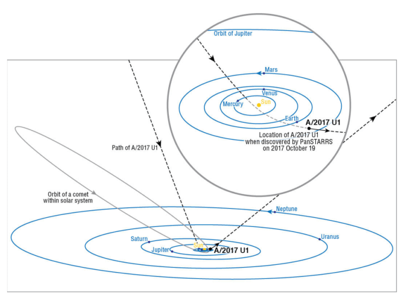 Com os dados obtidos, foi também possível estimar a órbita do objeto. Como mostra a Figura 2, fica claro que esse objeto veio de fora do Sistema Solar! É a primeira vez que detectamos um objeto extrassolar em nossa vizinhança.