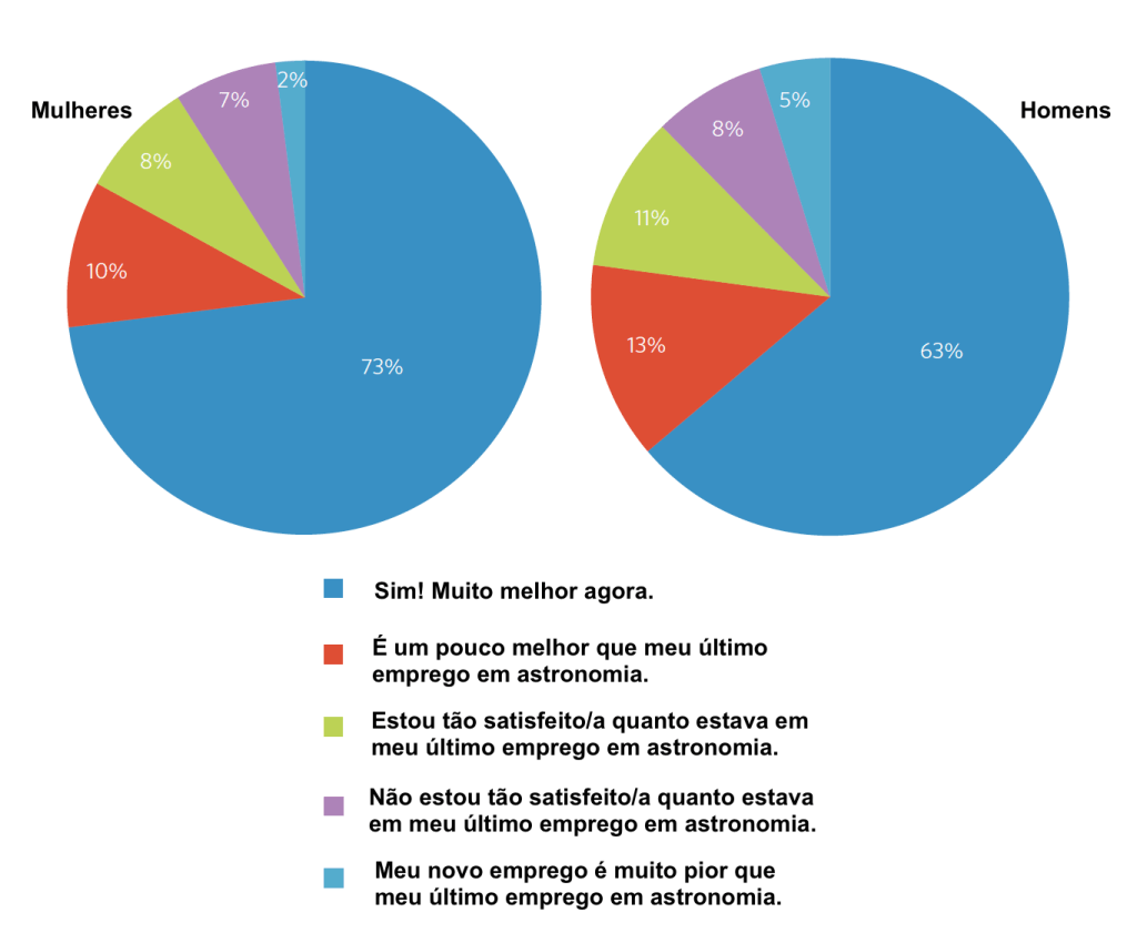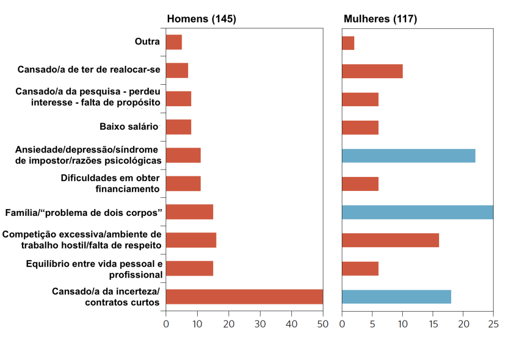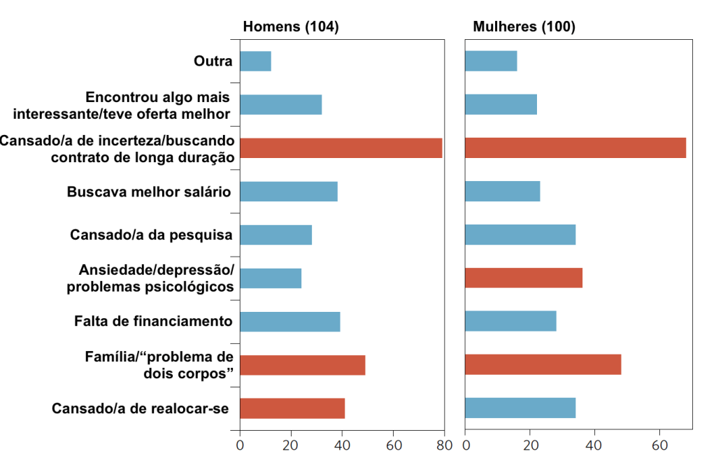 Isso permitiu notar que, para astrônomos ainda na academia, a principal razão para considerar deixá-la foi bastante diferente entre mulheres e homens (Fig. 1). Enquanto homens preocupam-se principalmente com o fato de muitos contratos serem apenas temporários, levando à incerteza profissional, a família e a saúde mental foram as principais preocupações das mulheres. Quando perguntados sobre razões adicionais, a incerteza foi a resposta prevalente, tendo sido escolhida por mais da metade dos participantes. Não surpreende que essa foi também a principal razão pela qual astrônomos que já deixaram a academia o fizeram (Fig. 2).