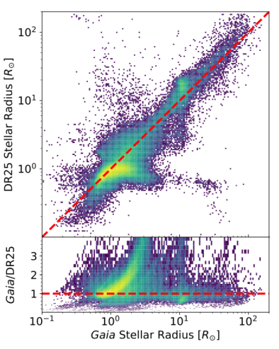 Das ~190.000 estrelas observadas pelo Kepler, os autores melhoraram as medidas de raio de mais de 180.00 0 delas. Com os dados do Gaia, os autores atingiram uma precisão 4-5 vezes melhor que medidas anteriores. Eles também descobriram que, apesar de que os raios de muitas estrelas permaneceram inalterados depois da correção do Gaia, há uma dispersão significativa quando as medidas são comparadas (veja Fig. 1). A cor nessa figura representa o número de estrelas (como se fosse um terceiro eixo: quanto mais amarelo, maior o número). Uma tendência 1:1 é mostrada como uma linha vermelha, indicando quando não há diferença entre as medidas antes e depois do Gaia. Para algumas estrelas Kepler, os dados do Gaia produzem raios maiores do que foram inicialmente relatados, principalmente para estrelas que foram reportadas ter o mesmo raio que o Sol.