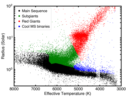 A Fig. 2 mostra o diagrama Hertzsprung-Russel (HR) de todas estrelas Kepler atualizadas. Os pontos pretos indicam estrelas na sequência principal (como o Sol), enquanto que os pontos verdes indicam as sub-gigantes, e os pontos vermelhos representam estrelas gigantes ou evoluídas. A principal tarefa do Kepler foi encontrar planetas parecidos com a Terra orbitando estrelas parecidas com o Sol, motivo pelo qual há um grande número de estrelas com temperaturas entre 5500 e 6500 K. Inicialmente assumimos que essas estrelas estavam na sequência principal, mas os autores agora mostram que uma boa parte delas são na verdade sub-gigantes, e estão começando a sair da sequência principal. De qualquer forma, 65% das estrelas-alvo do Kepler estão na sequência principal, enquanto que 23% são sub-gigantes e 12% são gigantes. Os autores notam que a re-classificação de estrelas pode levar a estudos futuros sobre a co-evolução de estrelas e planetas, já que muitas dessas sub-gigantes contêm sistemas planetários.