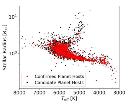 Mas e as estrelas que possuem sistemas planetários? A Fig. 3 mostra o diagrama HR contendo apenas estrelas com planetas confirmados (pontos vermelhos) ou candidatos (pontos pretos). De novo, há um acúmulo de estrelas em torno de 6000 K como visto na Fig. 2. Curiosamente, não encontramos muitos planetas em torno de estrelas grandes na sequência principal, mas isso é um viés de detecção porque os sinais são menores em estrelas grandes. Também parece haver um grande número de planetas candidatos em torno de estrelas gigantes. É difícil de confirmar esses planetas porque estrelas gigantes são ativas e podem apresentar falsos-positivos. Essas estrelas também são maiores que aquelas na sequência principal, o que cria trânsitos mais rasos.