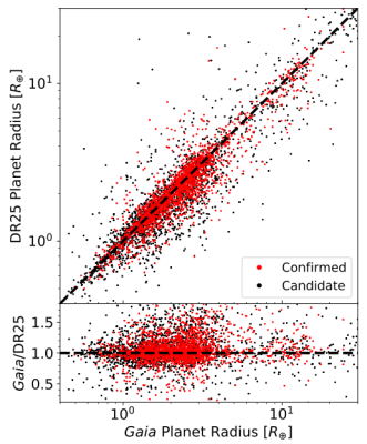 Quando comparamos os raios planetários antes e depois do Gaia, os resultados mostram menos dispersão do que as estrelas (veja Fig. 4). Isso é promissor, mas ainda há uma dispersão nos dados, especialmente entre planetas candidatos. Há também uma tendência para planetas maiores depois do Gaia, o que é consequência de encontrar raios estelares maiores. Os autores também concluem que raios estelares mais precisos providenciam melhores vínculos em raios planetários, apesar de isso variar planeta a planeta.