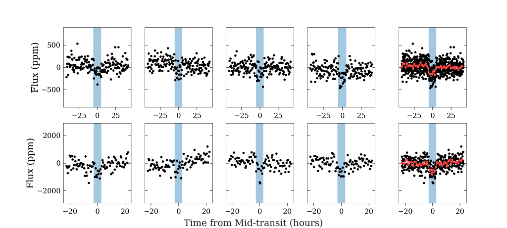 Para testar a eficácia de um método, primeiro se cria um conjunto de dados que não apenas não contenha trânsitos reais, mas também ruído com as mesmas propriedades dos dados a serem analisados. Uma maneira simples de fazer isso é inverter curvas de luz reais. Isso torna os trânsitos reais, que são diminuições no brilho da estrela, em aumentos de brilho. O software de análise busca então por trânsitos, que agora se sabe serem causados apenas por ruído, já que os trânsitos reais foram transformados em aumentos de brilho. Trabalhos anteriores encontraram que o Robovetter (um dos principais softwares utilizados para verificar trânsitos) tinha uma eficácia de 98.3% (ou seja, quase todos os falsos positivos são identificados corretamente, com apenas 1.7% identificados erroneamente como trânsitos reais). A Figura 1 mostra um exemplo do quão difícil pode ser essa identificação. Você consegue identificar quais conjuntos de dados referem-se a Kepler-452b e quais são curvas de luz invertidas, com trânsitos falsos causados por ruído? A resposta está no fim desta publicação!