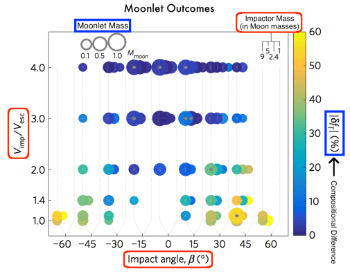Na Hipótese do Grande Impacto, um corpo impactante tem que acertar a Terra de frente (ângulo próximo a zero grau) e a alta velocidade (4 vezes a velocidade de escape) para produzir uma lua formada primariamente de material da Terra ao invés do impactante (e então possuir as mesmas razões isotópicas que o nosso planeta). No entanto, como a Figura 2 mostra, o modelo de vários impactos permite que os pequenos corpos impactantes colidam a velocidades menores (2 vezes a velocidade de escape) e com ampla variedade de ângulos (entre -30 e 30 graus) e ainda assim produz uma Lua com as mesmas razões isotópicas que a Terra.