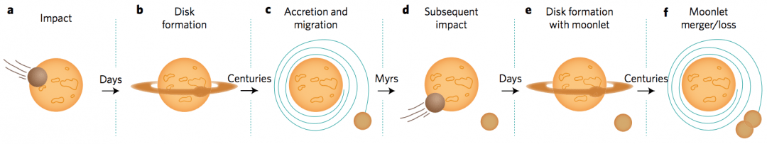 Como podemos ver na Figura 1, esse novo cenário começa do mesmo jeito que a Hipótese do Grande Impacto. Inicialmente, temos um embrião planetário com tamanho entre o da Lua e o de Marte colidindo com a Terra, espalhando uma imensa nuvem de detritos em órbita em torno do nosso planeta em apenas alguns dias. O detrito forma um disco que eventualmente coalesce a uma pequena proto-Lua (que os autores chamam de moonlet, ou mini-lua) ao longo de vários séculos. Durante esse tempo, a mini-lua gradualmente migra para longe da Terra à medida que a dissipação por marés diminui a sua velocidade de rotação.