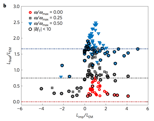 Os autores concluem que é mais difícil reproduzir os valores atuais do momento angular total do sistema Terra-Lua. Apenas 10% das cadeias de impacto terminam com valores de momento angular similares ao que observamos atualmente. No entanto, há um consolo no fato de que 50% desses sistemas atingem o atual valor de momento angular em algum momento durante a sequência de impactos, não somente no fim do mesmo. Esse problema de timing pode ser amenizado já que o momento angular pode aumentar ou diminuir drasticamente com cada impacto, e por isso é estabelecido aleatoriamente pelas propriedades dos últimos corpos impactantes.