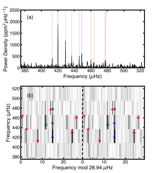 Convertendo a região onde a máxima potência é observada em amplitude, obtém-se o gráfico na figura 2. Comparando o padrão observado com outras 1500 estrelas observadas pela missão Kepler, os autores confirmaram que a estrela apresenta oscilação similares às do Sol. Além das frequências de pulsação em si, a diferença de valor entre as frequências de modos radiais pode fornecer informação sobre as propriedades da estrela. Esse valor é indicado em azul na Fig. 2.