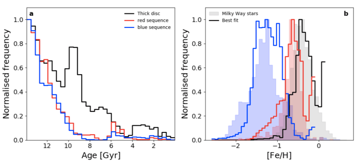Para compreender a história da Via Láctea como um todo, os autores buscaram caracterizar diferentes pedaços da nossa Galáxia (veja a Fig. 1). Em particular, eles estudaram um grupo de estrelas no halo, a parte externa da Galáxia. Essas estrelas têm velocidades orbitais maiores que 200 km/s e orbitam a estrutura principal da Galáxia em órbitas com diversas orientações. Após determinar a luminosidade de cada uma dessas estrelas, eles graficaram suas cores em um diagrama cor-magnitude. Os autores perceberam que algumas dessas estrelas do halo pareciam mais vermelhas (ou seja, mais brilhantes em comprimentos de onda longo) do que outras, que aparentavam ser mais azuis (mais brilhantes em comprimentos de onda curtos). Utilizando modelos de evolução estelar, eles determinaram as idades de ambas populações, que são mostradas com as linhas vermelha e azul no histograma da Fig. 2. Surpreendentemente, ambos conjuntos de estrelas têm o mesmo pico, em 13,6 Gyr, e o mesmo espalhamento em idades. Em outras palavras, ambas populações começaram e pararam de formar-se ao mesmo tempo, e a diferença em cor não tem nada a ver com a idade! Em vez disso, os autores atribuem a diferença em cor a uma diferença em metalicidade. As estrelas mais vermelhas devem ter formado-se em uma galáxia com maior metalicidade que as estrelas azuis, que se formaram em uma galáxia pobre em metais. Já foi proposto que a Via Láctea deve ter colidido e combinado-se com uma galáxia-anã conhecida como Gaia-Enceladus em algum momento da história. Já que galáxias-anãs são menos metálicas, os autores concluem que as estrelas mais azuis devem ter formado-se em Gaia-Enceladus.