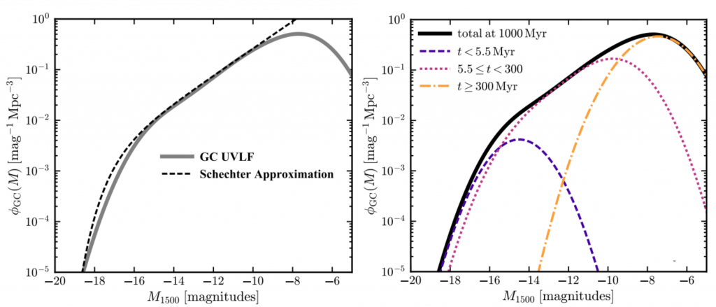 Ao modelar os UVLFs de GCs, o autor observou que, embora os GCs assumam uma distribuição em forma de sino no início de seu período de formação, o enfraquecimento passivo dos GCs de formação precoce, juntamente com a formação contínua de novos, empresta à UVLF intrínseca geral (não corrigida para extinção por poeira ou gás) uma forma de lei de potência com um corte em baixas luminosidades (magnitudes mais altas; veja a Figura 1). Isso significa que, em qualquer época, a porção brilhante da UVLF seria predominantemente modelada pelos GCs mais jovens, enquanto os GCs mais antigos contribuem para a maior parte da curva com baixas luminosidades.
