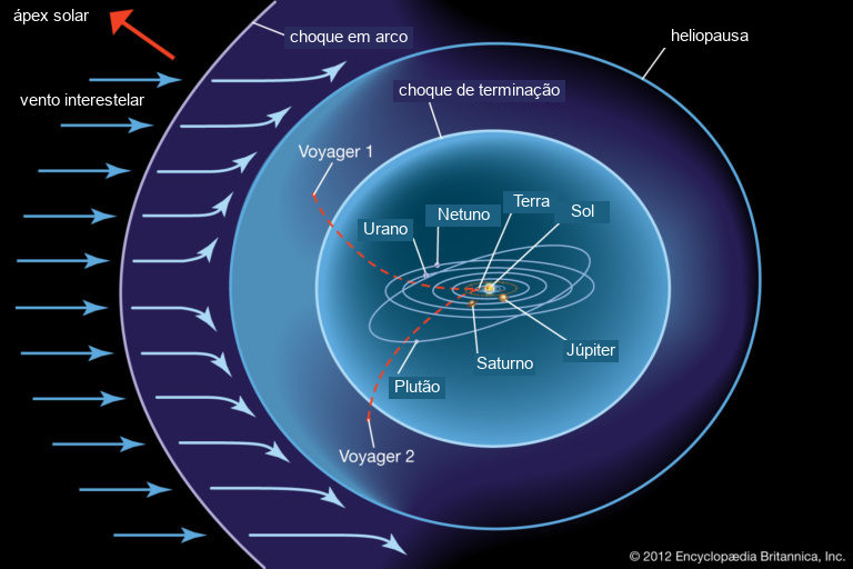 Depois de viajar muito além dos planetas do Sistema Solar, as duas missões Voyager chegaram pela primeira vez à região onde a velocidade do vento solar é subsônica, conhecida como “choque de terminação”. O próximo grande marco dessa viagem foi a heliopausa (veja ilustração na Figura 1). Essa é a região em que o Sistema Solar interage com a Galáxia em que habitamos, de modo que é importante e crucial estudá-la. Podemos aprender muito sobre como as forças e os campos magnéticos no plasma do meio interestelar confinam e influenciam o vento solar. A heliopausa é importante até para entendermos como a vida pode ocorrer ems sistemas solares é ela que nos protege dos perigosos raios cósmicos e de outras radiações de alta energia que podem ser desastrosas para a vida.