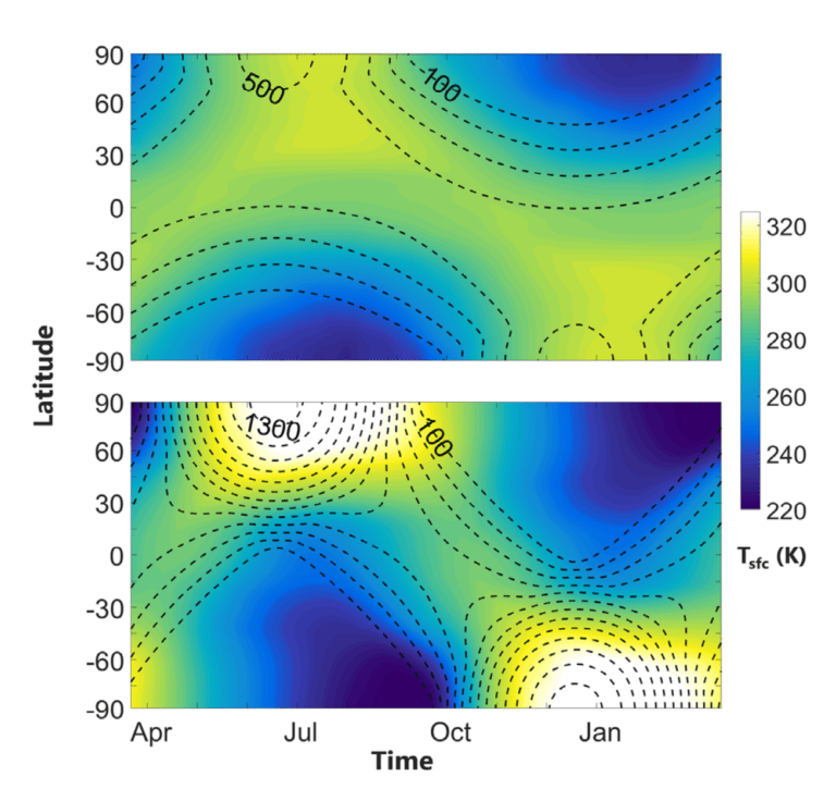 Ao contrário da Terra, em um planeta com mais de 54º de obliquidade, os pólos recebem mais luz solar, em média, que o equador. Isso resulta em forte aquecimento dos pólos durante o verão e rápido resfriamento durante o inverno, o que pode ser visto na Figura 1. Em um planeta com inclinação de 23,5º (painel superior), as latitudes médias indicam invernos e verões amenos. No entanto, um planeta com inclinação de 85º (painel inferior) aquece cerca de 20ºK a mais no verão e esfria 20ºK a mais no inverno. Uma diferença de temperatura média de 20 K pode não parecer muito, mas é a diferença entre Miami em julho e o Pólo Norte.