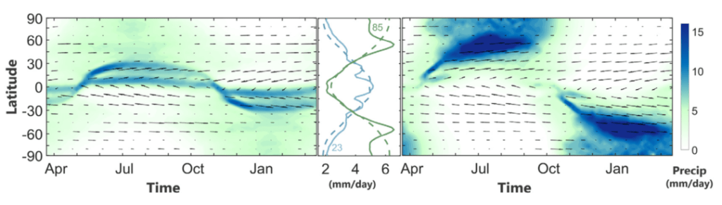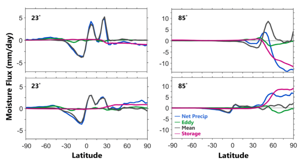 A Figura 3 compara esses três fatores. Para um planeta com inclinação de 23,5º (painéis esquerdos), a maior parte da precipitação líquida é causada pelo fluxo médio de umidade próximo ao equador. Em contraste, o planeta com 85º (painéis à direita) apresenta intensa precipitação devido às mudanças na capacidade de armazenamento. Essa diferença se encaixa no que foi mostrado na Figura 1: planetas de alta obliquidade têm variações de temperatura muito mais extremas. Quando o planeta com 85º aquece no verão do norte, sua capacidade de armazenamento aumenta muito e a atmosfera se enche de água. Contudo, o inverno nesse planeta ocorre rapidamente, diferentemente das estações graduais da Terra, assim a súbita queda de temperatura despenca a capacidade de armazenamento atmosférico, fazendo com que toda a água se precipite.