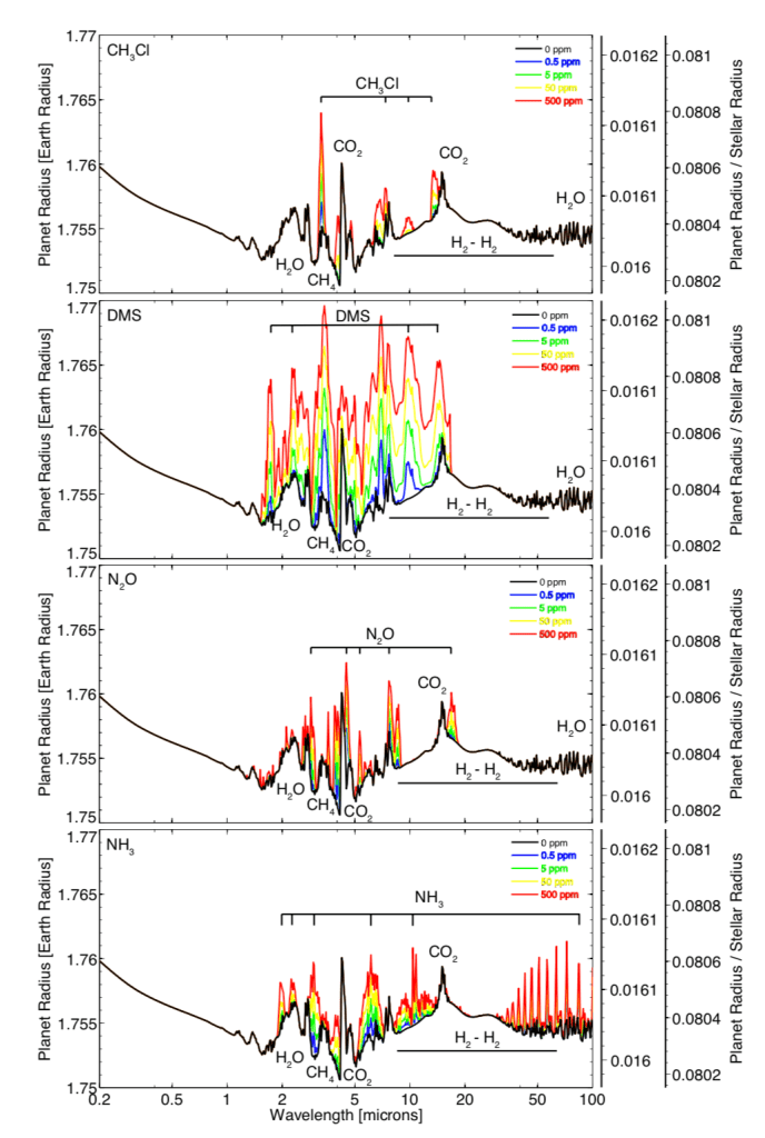 A formação de bioassinaturas em super-Terras dominadas por hidrogênio vai depender da radiação ultravioleta (UV) recebida pelo planeta. Ambientes com baixo UV (por exemplo, em órbita de anãs M de baixa atividade) produzem uma baixa concentração de H, e no caso bioassinaturas como CH3Cl e DMS são mais favoráveis. Outras bioassinaturas, como a amônia (NH3) que é resultante da extração de energia do ambiente, e N2O são favoráveis em ambientes tanto de baixo UV como em um nível de UV similar ao solar pois esses gases são destruídos por fotolíse e não por H.