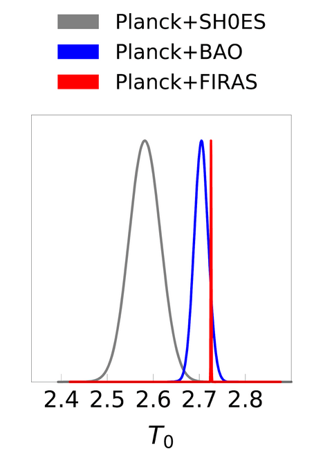 Os autores do artigo de hoje mudam a ordem deste processo. Eles usam o H0 do SH0ES como o prior do Planck para obter T0. A distribuição de probabilidade resultante do T0 é mostrada na curva cinza na Fig 1, junto com os vínculos restritivos do FIRAS sozinho sobre T0. A T0 medida dos experimentos combinados do Planck e SH0ES apresenta forte tensão com a medida do FIRAS. Então, ao invés de ter diferentes valores para H0 em Planck+FIRAS e SH0ES sozinhos, podemos ter valores diferentes de H0 em Planck+SH0ES e FIRAS sozinhos. Consequentemente, poderia existir não uma tensão de Hubble, mas uma tensão de T0.