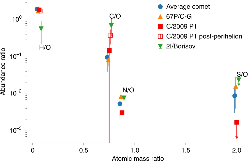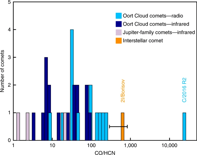 Embora a maioria das propriedades do 2I/Borisov sejam semelhantes a cometas do sistema solar, o resultado que se destacou na análise das observações do HST e do ALMA foi a concentração de CO. Tanto o HST quanto o ALMA detectaram fortes linhas espectrais de emissão de CO, cujas intensidades foram usadas para deduzir a quantidade deste gás sendo liberada pelo cometa. Os resultados mostraram uma taxa de abundância extraordinariamente alta de CO/H2O de cerca de 35-155%, muito maior do que o valor médio de 4% em cometas do nosso sistema solar (Figura 1). Mesmo cometas da Nuvem de Oort, que vêm do Sistema Solar externo, mais frio e rico em gás volátil, têm razão CO / H2O na faixa de 10% a 24% (Figura 2). Isso torna 2I / Borisov um dos cometas mais ricos em CO já observados.