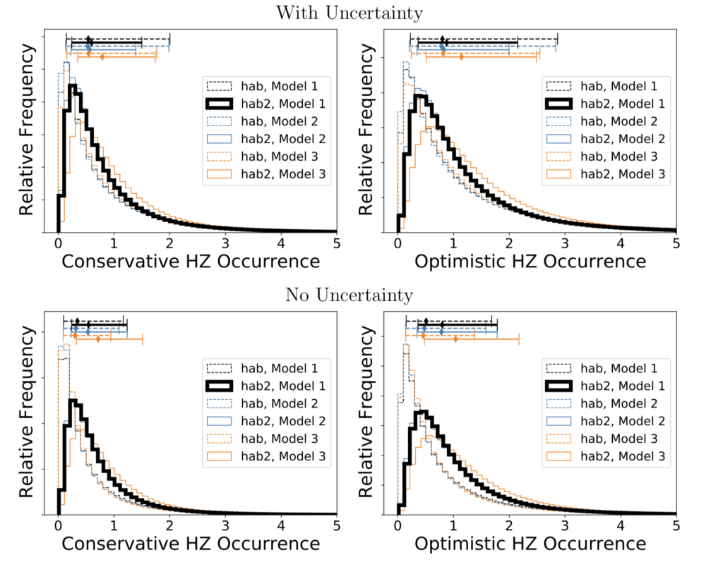 Os pesquisadores então estimaram as taxas de ocorrência usando uma variedade de modelos, populações estelares e métodos de computação. Eles limitaram sua análise a exoplanetas semelhantes em tamanho ao da Terra e, portanto, provavelmente rochosos (raios entre 0,5 a 1,5 vezes o da Terra) e estrelas com idade e temperatura semelhantes às do Sol (entre cerca de 4800 K e 6300 K ). Eles também consideraram dois cenários usando uma definição conservadora ou otimista dos limites da zona habitável interna e externa.