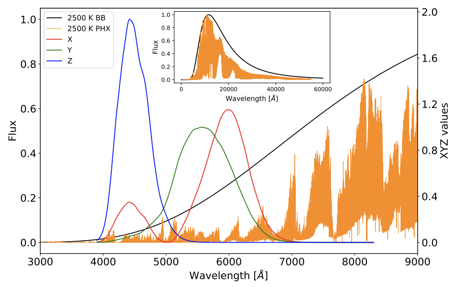 Os autores geraram espectros de modelo estelar (usando a biblioteca PHOENIX) para estrelas em um espaço de temperaturas entre 2300 K a 15.000 K, em metalicidade de [Fe / H] = (0, -1, -2), para explicar como a absorção em diferentes abundâncias dos metais mudaram os espectros. Eles também geraram espectros de até 55.000 K, usando um modelo diferente (TLUSTY) que representou as camadas externas “mais soltas” dessas estrelas massivas. Para imitar a recepção do olho humano, eles usaram funções de correspondência de cores estabelecidas (CMFs), que modelam a recepção do olho humano em comprimentos de onda Vermelho, Verde e Azul (RGB) e mapeiam isso para códigos de cores hexadecimais. A Figura 1 acima mostra esses CMFs sobre o espectro de uma estrela de 2500 K – uma anã vermelha.