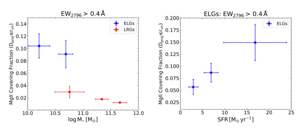Para ELGs, a tendência com a massa estelar não é tão clara, no entanto, eles mostram uma forte correlação entre a fração de cobertura e a taxa de formação de estrelas. ELGs com altas taxas de formação de estrelas têm uma fração de cobertura de Mg II muito mais alta do que aqueles com taxas de formação de estrelas mais baixas.