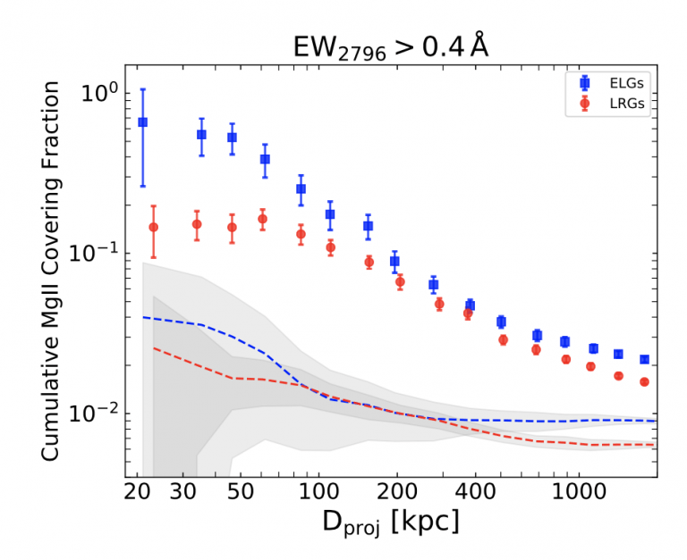 Para cada uma dessas galáxias, os autores calculam a fração de cobertura do gás Mg II, ou seja, a razão do número de absorvedores de Mg II ao redor de uma galáxia, dividido pelo número de quasares que são visíveis por aquela galáxia. Isso os ajuda a entender como esses absorvedores são comuns para cada tipo de galáxia. Os autores encontraram uma diferença clara entre a fração de cobertura para ELGs e LRGs, com ELGs tendo uma fração de cobertura um fator de 2 a 5 vezes maior do que LRGs em pequenas distâncias.