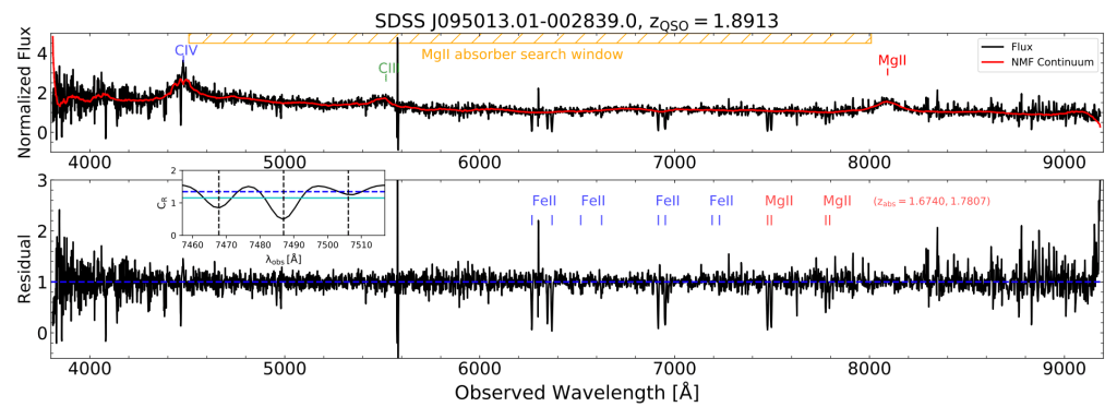 A Figura 1 abaixo mostra um exemplo do resultado do código. Para ser capaz de identificar as linhas de absorção, os autores primeiro modelam a emissão contínua do quasar e calculam o espectro residual (a razão dos dados de fluxo e o modelo do contínuo, neste caso). Quaisquer quedas no espectro residual (painel inferior da Figura 1) abaixo de um nível de fluxo de 1 indicam uma possível linha de absorção. O código então determina uma janela de comprimentos de onda para conduzir a busca, tomando cuidado para evitar quaisquer linhas de emissão e absorção do próprio quasar. Uma vez que uma possível linha de absorção foi encontrada na janela de procura, o código a compara a um modelo gaussiano baseado no perfil de linha típico das transições atômicas de Mg II. Quaisquer linhas de absorção possíveis que atendam aos critérios de seleção (como a relação sinal-ruído) são então adicionadas ao catálogo para análise posterior.