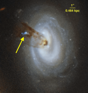 Um zoom na imagem do HST (Figura 2) também revela uma pequena mancha brilhante, localizada em uma nuvem de poeira. A cor desta mancha, que é brilhante nas bandas azul e UV e mais fraca no vermelho, indica que se trata de um “aglomerado” de formação estelar em andamento. Na verdade, as observações do HST encontram 37 manchas brilhantes (mostradas na Figura 3), e a análise de suas cores mostra que 10 delas são aglomerados de formação estelar, todos encontrados na cauda do gás. As 27 outras fontes são principalmente fontes de fundo, como galáxias distantes.