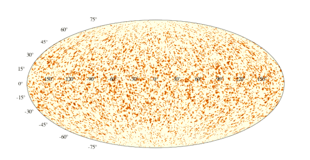 Em simulações, os pesquisadores geraram um catálago de muitas galáxias onde algumas eram selecionadas aleatoriamente para conter eventos de BNS, como mostra a Figura 1. Depois de selecionar o formato dos dados, para obter a medida foram utilizados em torno de 10000 BNS que suspostamente seriam detectados em um intervalo de 7 a 10 anos para redshift menor ou igual a 0.3.