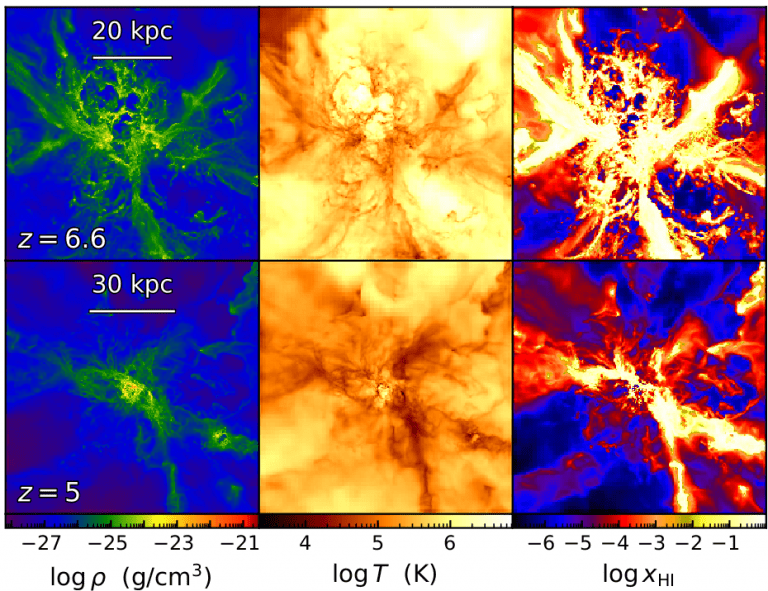 Os autores usam uma simulação “zoom-in”, que envolve a reexecução de um pequeno pedaço de uma grande simulação cosmológica em alta resolução para focar na evolução de uma estrutura menor. Neste caso, eles aumentam o zoom em uma galáxia (Figura 1) e simulam os processos hidrodinâmicos e a transferência radiativa dentro da galáxia para estudar como a produção de Lyα flui e reflui, e também como eventualmente escapa da galáxia. Não é tão simples quanto modelar como os fótons Lyα estão sendo criados por recombinação (ou seja, gás de resfriamento) e colisões também; os autores ainda têm que modelar como os fótons Lyα se movem através do meio interestelar (ISM), o gás ao redor das estrelas dentro de uma galáxia, e para fora no meio intergaláctico (IGM), o gás situado entre as galáxias e principalmente ocupado pelos filamentos da rede cósmica.