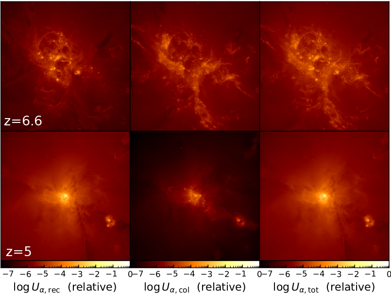 Ao rastrear todos os fótons Lyα e medir a distância que cada pacote de fótons viaja antes de ser absorvido, os autores são capazes de encontrar a densidade de energia Lyα em cada célula da simulação, construindo uma imagem 3D de como o espalhamento ressonante ocorre na galáxia. (Figura 3). Eles descobriram que, ao longo do tempo, há um aumento da densidade de Lyα na região central da galáxia, e que a Lyα formada pela recombinação no gás de resfriamento tem mais probabilidade de ser absorvida, ou aprisionada, do que a Lyα associada a colisões. Além disso, quando uma grande quantidade de Lyα é capturada desta forma, Lyα pode transferir uma quantidade significativa de momento para o gás, levando a interrupções na formação de estrelas, crescimento de buraco negro supermassivo e acréscimo de gás IGM na galáxia. Os autores concluem que este efeito pode ser particularmente importante para regiões da galáxia ligadas a filamentos cósmicos, embora provavelmente possa ser negligenciado para o restante da galáxia.