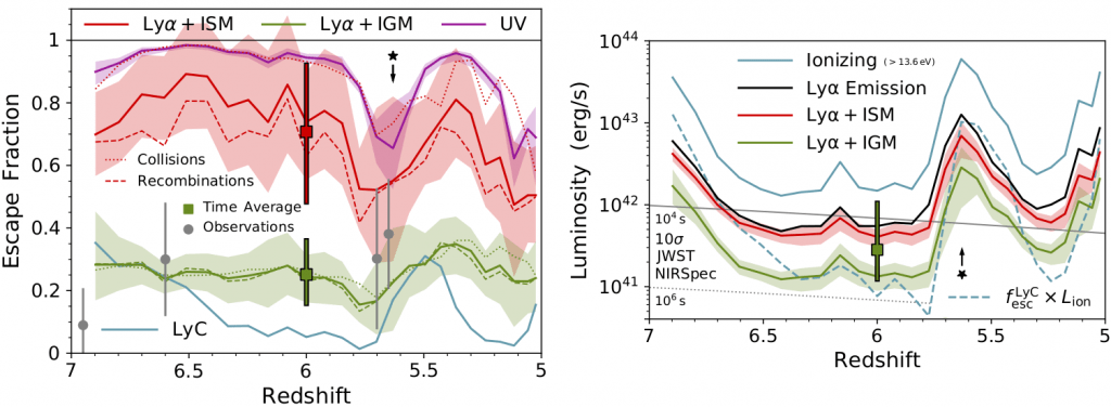Levando em consideração as propriedades simuladas de suas galáxias com o tempo, os autores veem como o brilho intrínseco e a fração de escape (ou seja, a fração de fótons Lyα que podem realmente escapar através do IGM) evoluem no tempo (Figura 2). Os autores veem que o brilho Lyα diminui gradualmente com o tempo, mas aumenta quase imediatamente quando a galáxia sofre uma explosão de formação de estrelas. Curiosamente, a fração de escape de Lyα não aumenta imediatamente. Só depois de 55 milhões de anos é que mostra um pico. Evidentemente, a fração de escape de Lyα será afetada pela formação de estrelas, mas haverá um lapso de tempo. Além disso, as regiões com perfis Lyα dominados por vermelho tendem a ter grandes larguras de linha (chamadas larguras equivalentes). Em outras palavras, as larguras de linha excepcionalmente grandes vistas ao visualizar certas regiões da galáxia parecem ser criadas por fluxos de saída na simulação nesses locais. Por outro lado, regiões com larguras de linha baixas mostram perfis Lyα dominados por azul e podem indicar a presença de um filamento de gás externo, talvez contribuindo para um influxo.