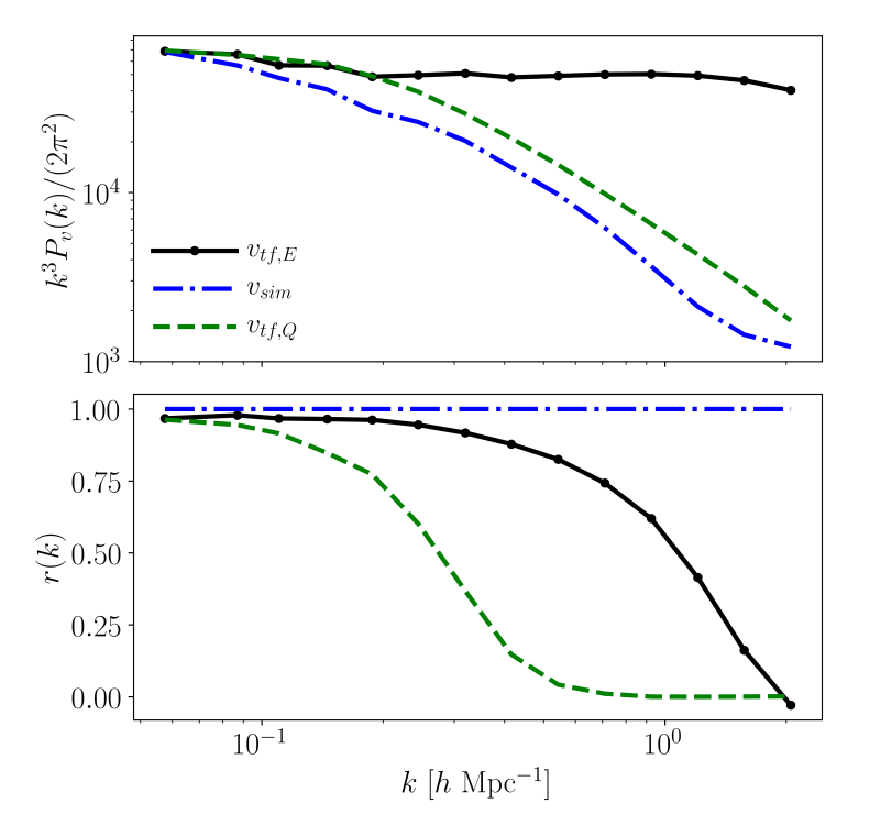 Os autores também analisaram o espectro de potência da velocidade. A Figura 3 mostra o espectro da simulação, no contexto Euleriano e Lagrangiano. Com a simulação, há uma queda mais rápida do espectro em escalas menores que os outros resultados. Isso acontece por conta dos efeitos de Dedos de Deus, já que no valor “real” da simulação não foi usado o espaço de redshift. No painel de baixo, vemos o coeficiente de correlação comparado com a simulação (em azul). A descrição Euleriana é mais correlacionada que a Lagrangiana, mas só em grandes escalas.