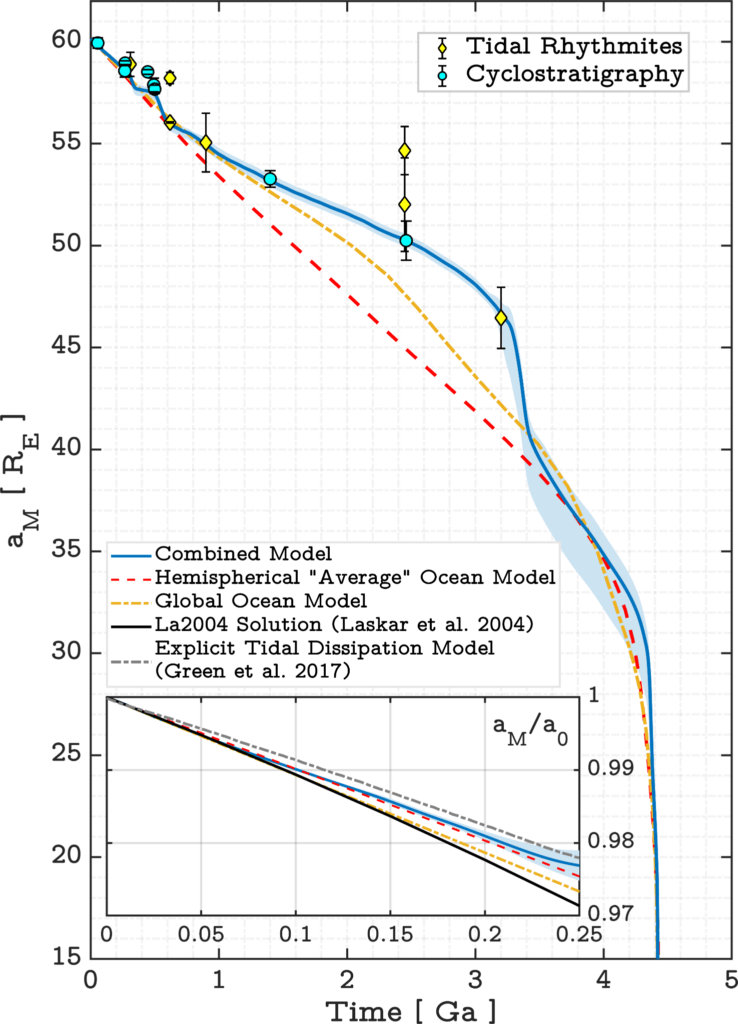 A fim de ver como esses modelos se comparam com a história Terra-Lua real, os autores mostram dados geológicos que carregam informações sobre a distância da Lua sobrepostos aos melhores ajustes obtidos para esses três modelos (Figura 2). Como um lembrete, eles não usaram estes dados para criar os modelos. Ainda assim, o ajuste deles a estes pontos é impressionante, especialmente para o modelo mais realista, que combina o modelo oceânico global com o hemisférico. Este modelo também demonstra alguns períodos de ressonância, onde o torque era grande e a Lua rapidamente se afastou (como a 3,35 bilhões de anos atrás, mas também em épocas mais recentes tais quais 350 e 600 milhões de anos atrás). Inclusive, podemos estar em um período de ressonância neste exato momento!