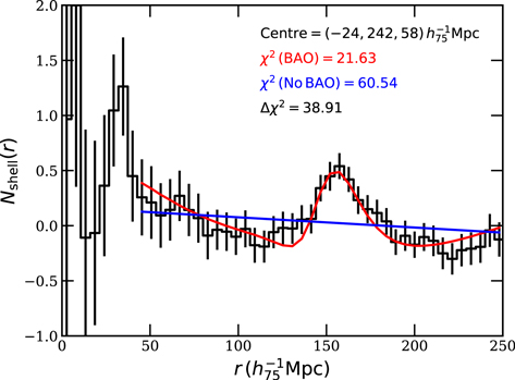 Diferente do método tradicional, foi preciso analisar se a estrutura era de fato uma frente de onda esférica de BAO ou não. Como não estamos olhando para a estrutura de grande escala com milhões de galáxias, é preciso contar pares de cascas esféricas a raios fixos de menores para maiores escalas, ou seja, como numa cebola.