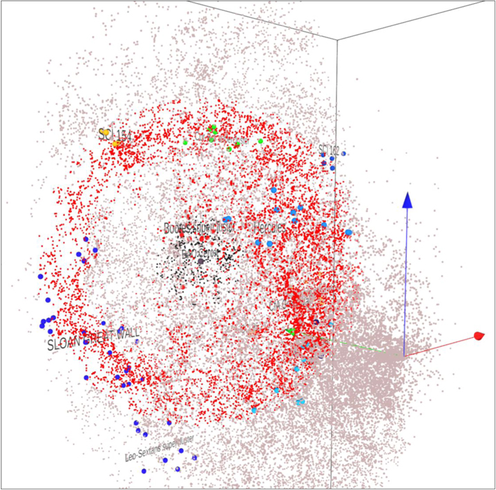 Diferente do método tradicional, foi preciso analisar se a estrutura era de fato uma frente de onda esférica de BAO ou não. Como não estamos olhando para a estrutura de grande escala com milhões de galáxias, é preciso contar pares de cascas esféricas a raios fixos de menores para maiores escalas, ou seja, como numa cebola.