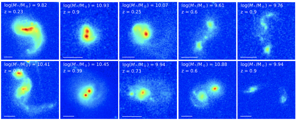 Há uma variedade de métodos para identificar galáxias em fusão. Caso você tenha resolução espacial suficiente, significando que você pode ver a extensão da galáxia em vez de apenas uma fonte pontual, frequentemente verá a evidência apenas a olho nu. Na Figura 1, você pode ver um belo exemplo de uma fusão local. Essas são chamadas Galáxias Ratos, ou NGC 4676. Essa fusão está perto o suficiente para que possamos vê-la em ação — os dois núcleos galácticos são claramente distinguíveis, e nós podemos ver até mesmo uma ponte conectando-os, assim como caudas de maré brilhantes de estrelas e gás fluindo para longe da colisão. Características similares são identificadas no campo COSMOS pelos autores de hoje, alguns exemplos são mostrados na Figura 2. No total, 3594 galáxias de 33605 foram identificadas como fusões através da inspecão visual e da procura por essas pistas.