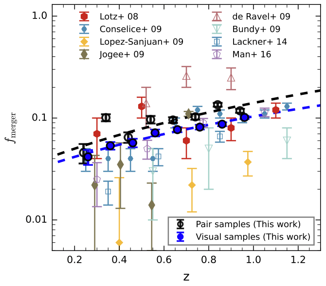 As galáxias em fusão identificadas nesse trabalho abrangem um intervalo de redshift 0.2-1 — em termos de tempo, é de 2 bilhões a 8 bilhões de anos atrás. Contando todas as galáxias detectadas nas observações do artigo, e classificando-as como em fusão ou não através dos métodos acima, podemos ver que a fração de fusão (número de fusões dividido pelo número total de galáxias da amostra) aumenta em função do redshift na Figura 3. Como previsto, há, com certeza, mais fusões nos primórdios do universo. A partir dessa evolução, é estimado que uma galáxia massiva no universo com redshift < 1 irá experimentar, em média, uma grande fusão a cada 10 bilhões de anos.