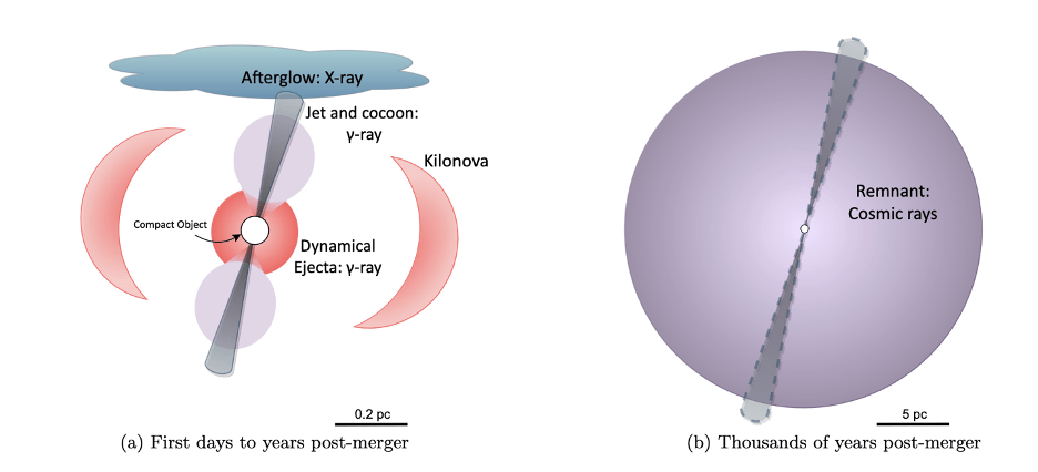 Quando um sistema binário de estrela de nêutrons SBEN (ou um sistema ENBN) colide, a explosão resultante constitui um evento bastante complexo que, dependendo de como é observado, emite uma combinação de raios-x, raios-gama, raios cósmicos, nêutrons e material ejetado diretamente do centro do sistema. O painel esquerdo da Figura 1 do artigo mostra a anatomia deste evento, evidenciando as diferentes fontes de emissão da colisão ao longo do passar do tempo. O painel direito da Figura 2, contudo, mostra o que ocorre milhares de anos após essa explosão. Neste caso, a onda de choque emitida da colisão acaba “varrendo” o material interestelar ao seu redor, criando assim uma espécie de bolha neste meio interestelar. Este material continua a se espalhar conforme o tempo, sempre se distanciando da localização original da colisão original.