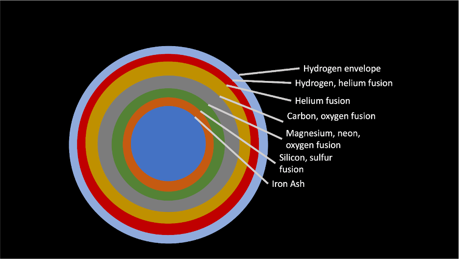 A medida que uma estrela massiva se desenvolve e se aproxima da velhice, ela desenvolve uma estrutura de “cebola”, tendo camadas de elementos progressivamente mais densos próximos ao seu núcleo, com ferro no centro (veja a Figura 1)